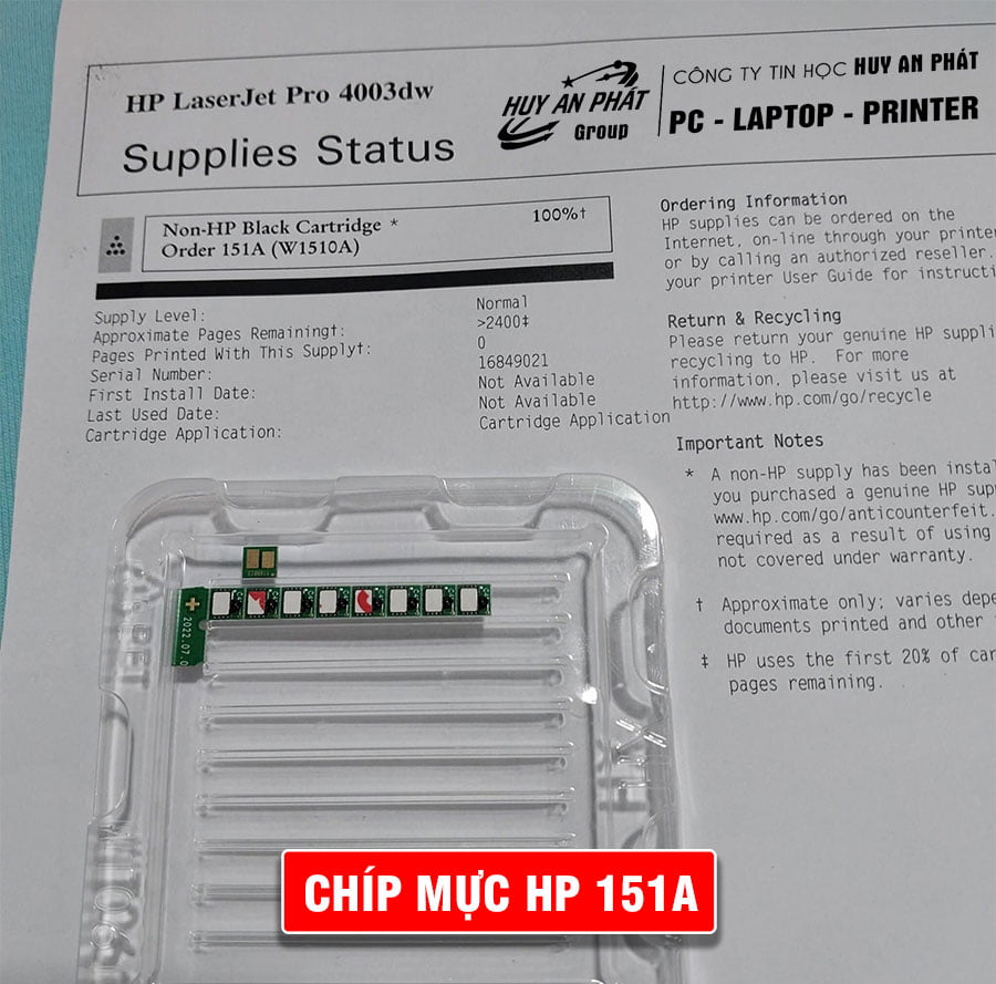 Cửa hàng bán Chíp hộp mực Hp 151a được sản xuất theo tiêu chuẩn chất lượng Quốc tế và thông số kỹ thuật chính xác, vì vậy người dùng có thể hoàn toàn yên tâm về độ tương thích và tính ổn định của mực. Sản phẩm dùng cho Hộp Mực in laser HP 151A (W1510A) được thiết kế dành riêng cho các dòng máy in HP LaserJet Pro 4003dn, 4003dw để tạo sự đồng bộ hoàn hảo nhất.